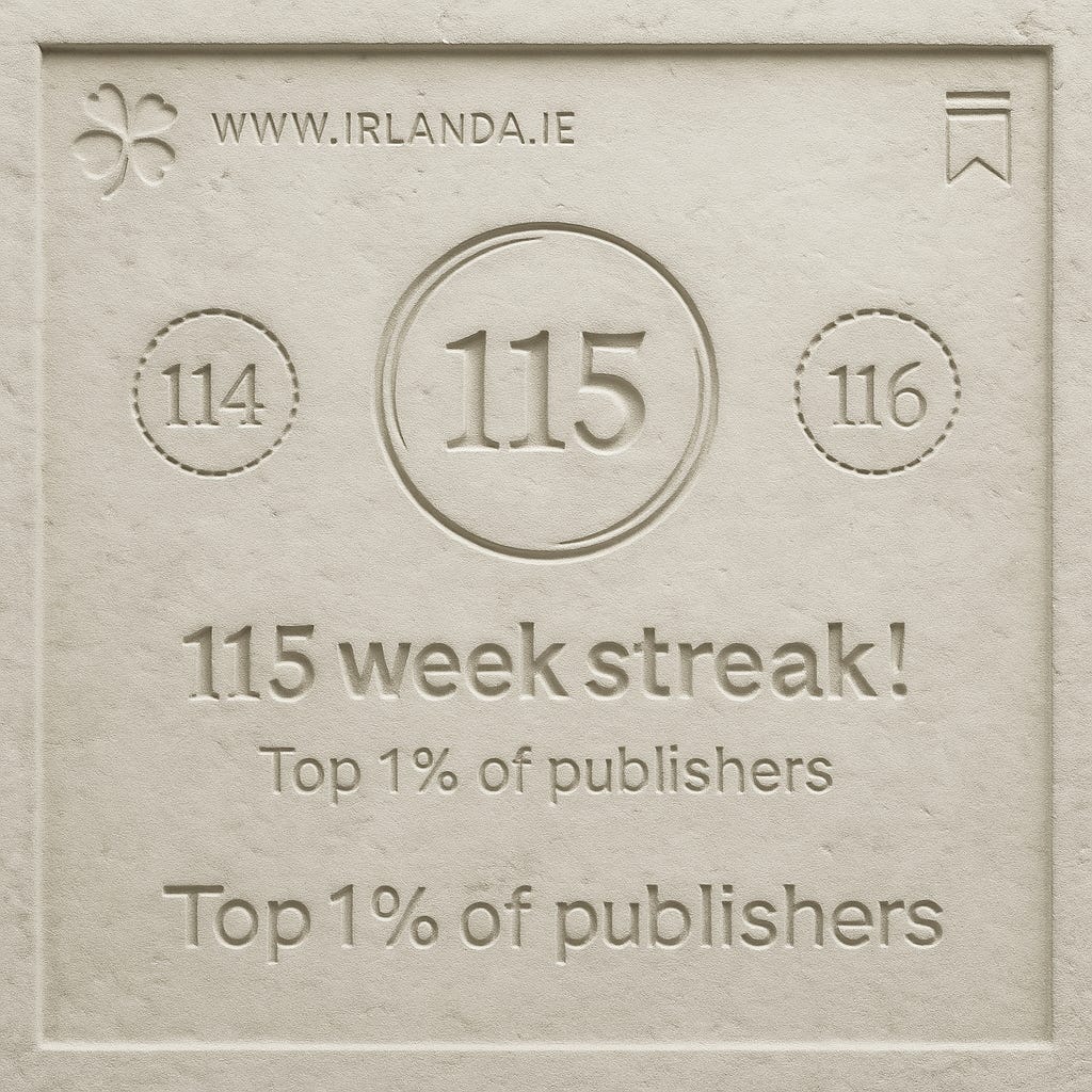 Substack si-a dorit sa ma anunte ca am 115 saptamani de cand am inceput modestul meu proiect hobby cu “Irlanda.ie” si mi-a trimis si o poza. Mi-a placut in draci numarul 115, mult mai mult decat 100, ala nu mi-a spus mai nimic, asa ca m-am gandit sa ii fac si o placa de marmura virtuala.