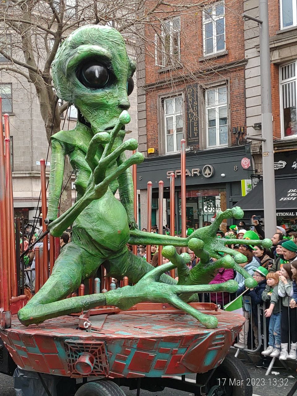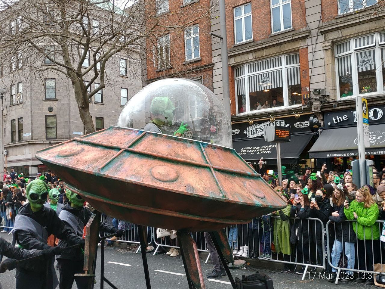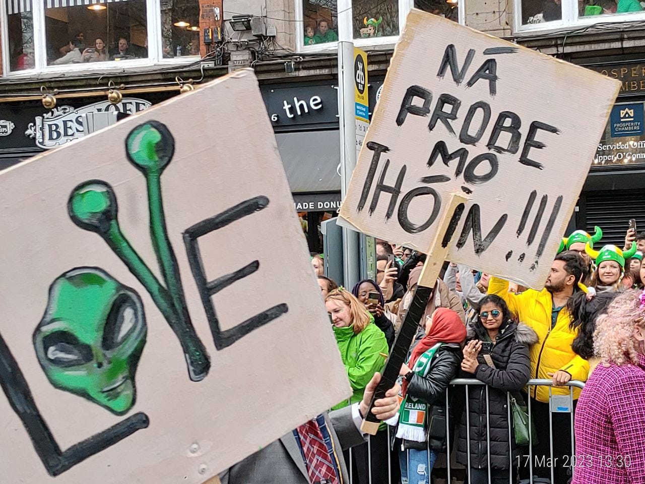 Am ajuns la “Teapa” (just in case: monumentul din centrul Dublinului) cat sa prind un loc bun la strada, lipit de balustrada. (Pro-tip: nu va lasati sub nicio forma separati de balustrada. Balustrada este viata. Daca intre voi si balustrada se strecoara chiar si un mini-migrant nu aveti nicio scuza si nicio scapare. Puteti pleca acasa, nu mai vedeti nimic din parada. E game-over.)