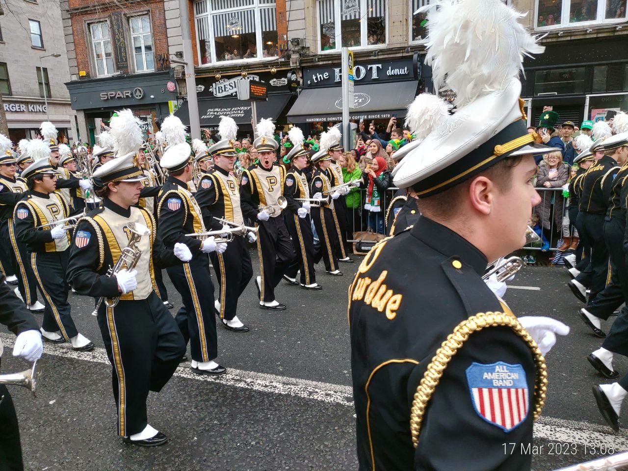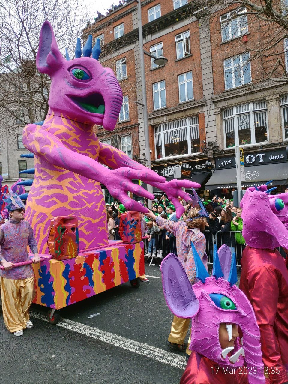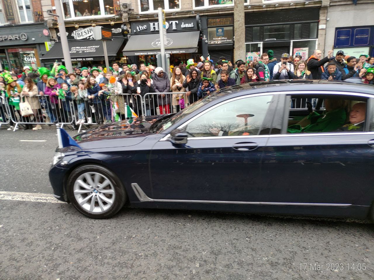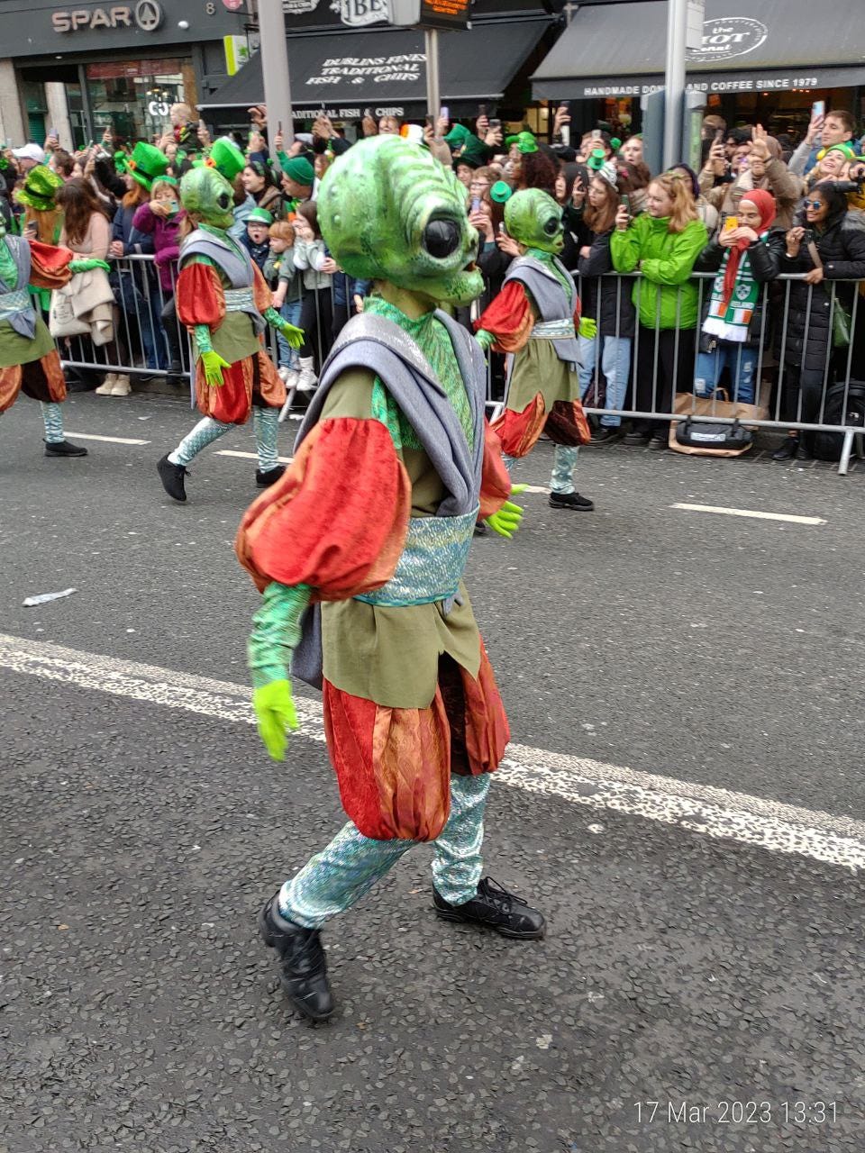Am ajuns la “Teapa” (just in case: monumentul din centrul Dublinului) cat sa prind un loc bun la strada, lipit de balustrada. (Pro-tip: nu va lasati sub nicio forma separati de balustrada. Balustrada este viata. Daca intre voi si balustrada se strecoara chiar si un mini-migrant nu aveti nicio scuza si nicio scapare. Puteti pleca acasa, nu mai vedeti nimic din parada. E game-over.)