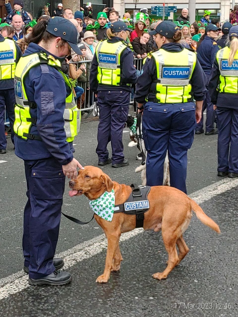 Cum stateam asa afundat in ganduri a venit un cutu-cutu din ala de la vamesi fix la mine si ma mirosea cu mare interes pe la buzunare. Recunosc ca m-am gandit o milisecunda daca “n-ar fi ironic sa te prinda cainele vamesului cu ceva nepotrivit fix la parada de Sf. Patrick?” L-am descurajat delicat, fara sa ii antagonizez stapana.