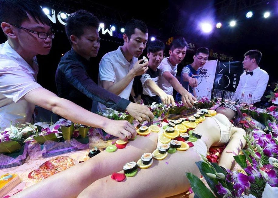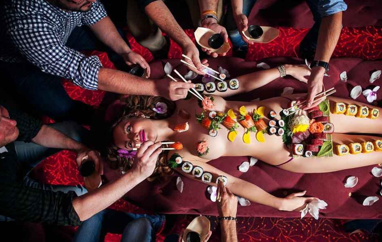 Un posibil raspuns ne vine din Țara Soarelui Rasare, unde de ceva vreme aristologii cu ochii oblici vor sa ne convinga ca cea mai buna varianta de a manca sushi este sa folosim o doamna ca platou. Preferabil una fara vergeturi, ca sa manance si dl. Buhnici.