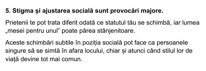 Pentru cei mai multi dintre ei a fi solo nu a fost o alegere clara, facuta cu intentie. Nu este un “incepand de luna viitoare vreau sa traiesc singur(a) ”. Pentru cei mai multi oameni singuratatea nu este o alegere asumata ci este ceva ce li se intampla, vine peste ei. Un accident, boala, moarte sau cel mai des banalul, un divort.