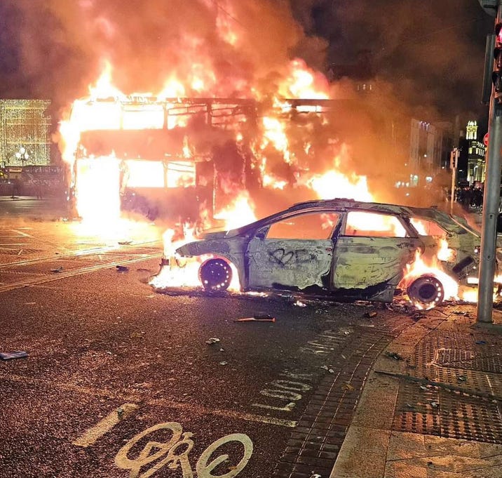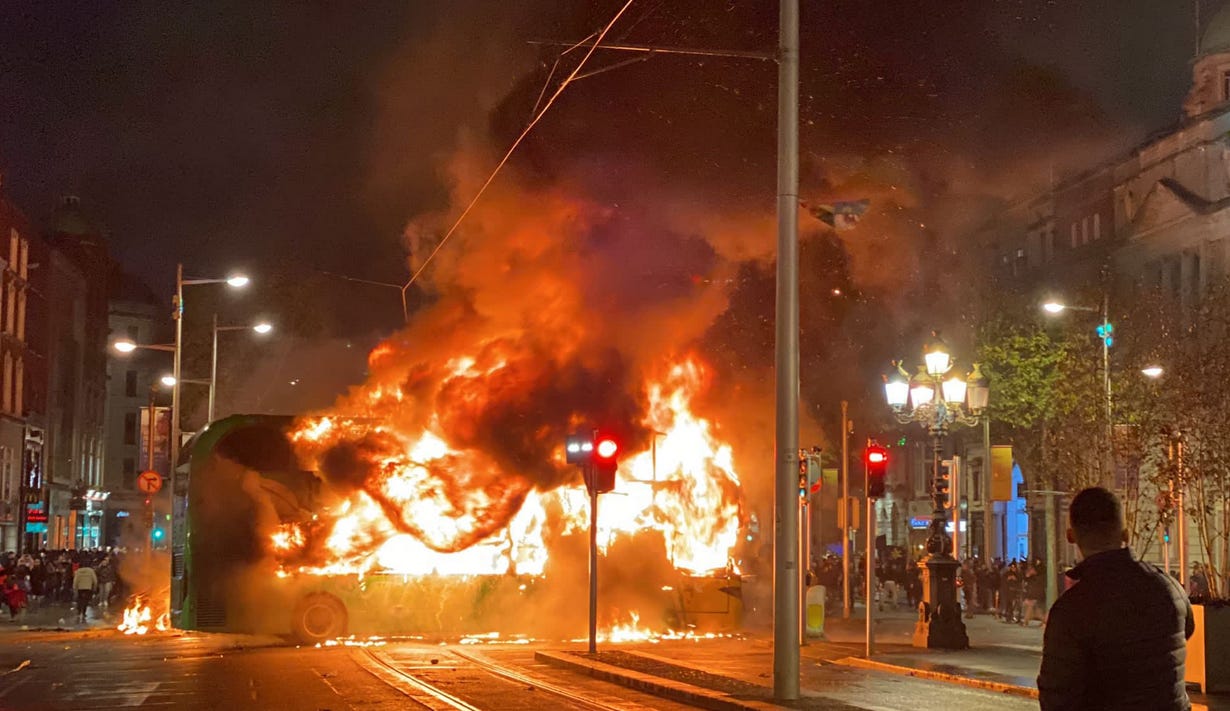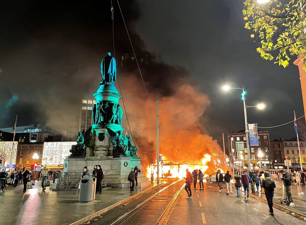 Bilantul de Vinerea Neagra din Dublin arata pana acum cam asa: trei copii si o femeie injunghiati, un tramvai si trei autobuze incendiate, 11 masini de politie distruse si 13 magazine care si-au epuizat stocul in cateva minute. Un alt fel de Black Friday.
