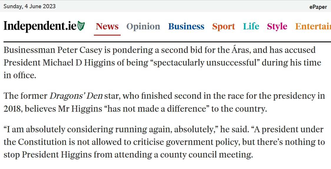 omul de afaceri Peter Casey se gandeste la fotoliul de presedinte al Irlandei. Un fel de Donald Trump mai putin orange, dar la fel de colorat in multe alte feluri.