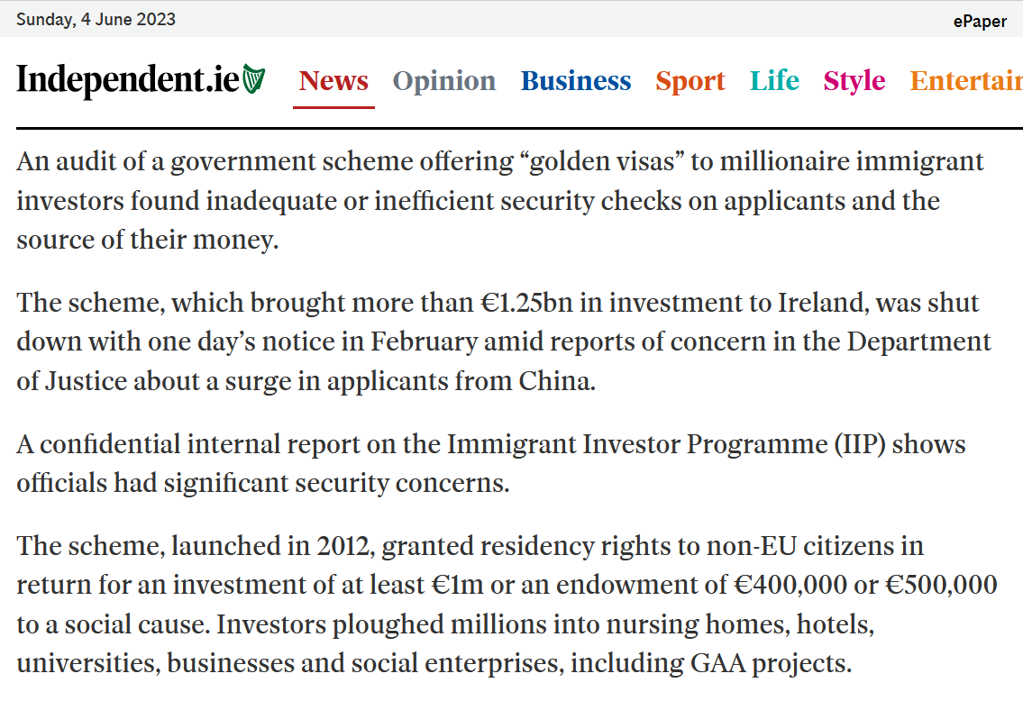 una din povestile Tigrului Celtic care parea inteligenta dar in final s-a dovedit foarte problematica au fost “vizele de aur“, adica rezidenta acordata unor persoane non-EU in schimbul unor investitii. Impreuna cu cea cu cetatenia irlandeza acordata tot pe investitii.