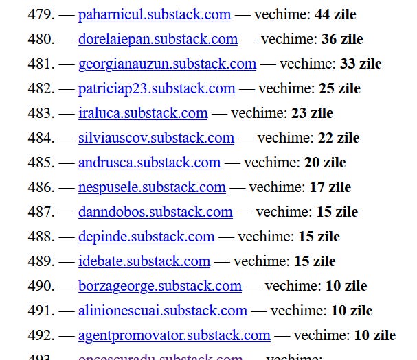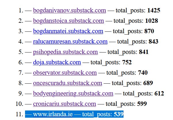 Iar din intrebarea initiala “care e cel mai mare newsletter românesc de pe Substack“ am extras ideea si am sa adaug la “revista presei substackurilor romanesti” pe care o public zilnic la Paradigma si aceasta informatie, numarul total de articole de pe fiecare publicatie. Poate foloseste cuiva.