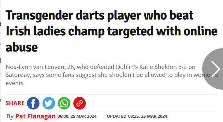 Sau o alta stire, cum ca opinia publica l-a sanctionat (deocamdata doar online) pe un domn imbracat in femeie (= “transgender“) care a insistat sa participe la competitii sportive pentru femei.