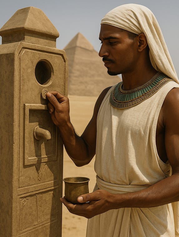 Imaginati-va urmatoarea scena: un locuitor oarecare din Egipt din secolul unu se apropie solemn de un templu impunator, baga o moneda intr-o cutie de metal si ii curge o portie fixa de apa sfintita. Egipteanul foloseste primul automat din istorie. Si care functiona mai bine decit multe aparate moderne, astea care refuza bancnotele, ca ala nu dadea rateuri.