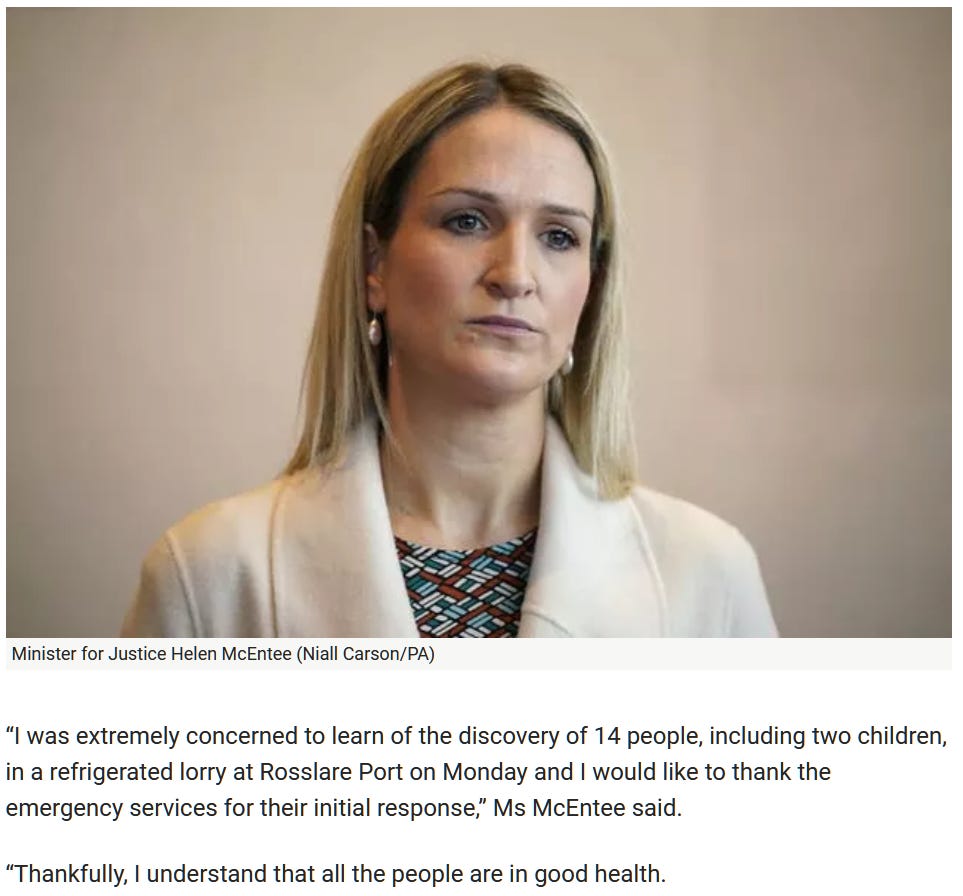 Tot publicul larg progresist din Irlanda plange impreuna cu cei 14 migranti ilegali descoperiti intr-un container frigorific din Rosslare. Plange de fericire, ca au ajuns cu bine, au ahibernizat cu succes. Si de dificultatile intampinate, ca au trebuit sa faca o gaura in container ca sa poata respira mai bine.