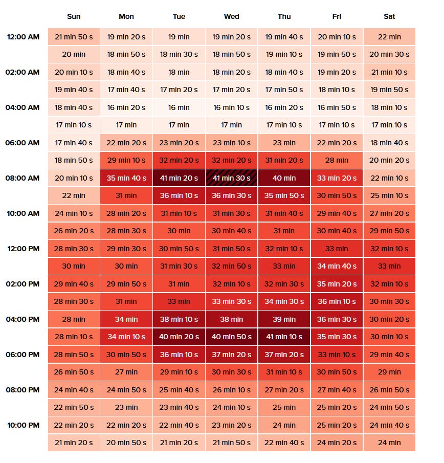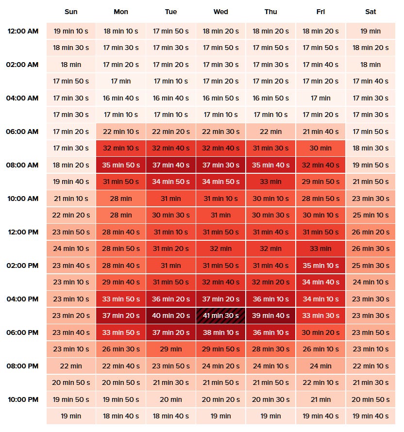 Cel mai prost interval de timp de a conduce in Dublin este miercuri dimineata, intre 8 si 9 cand 10 km sunt parcusi in medie in 41 de minute si 30 de secunde.