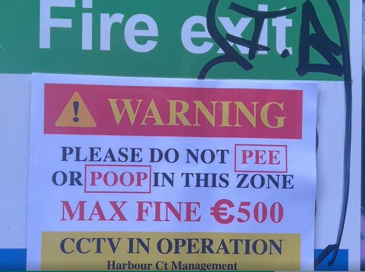Nu stiu in cate capitale europene poate fi intalnita interdictia expresa de a folosi o strada pe post de toaleta, Dublinul este una dintre ele. Sigur, in conditiile in care nu exista toalete publice, altele decat strazile.