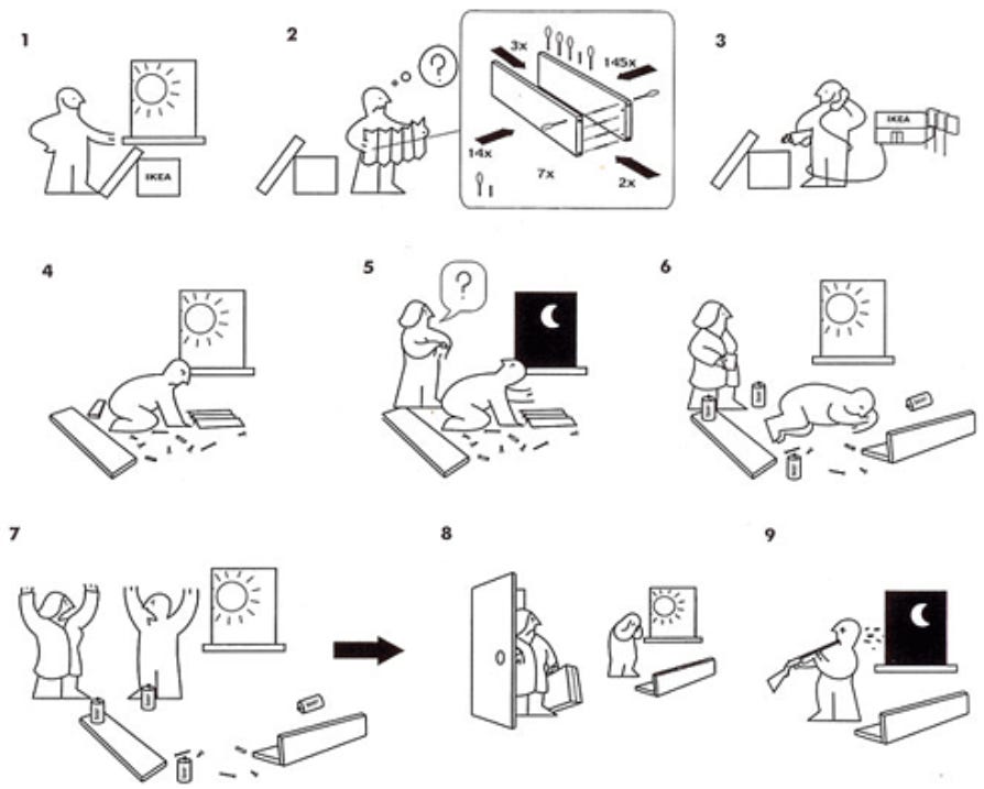 Nu îmi amintesc să fi avut vreodată probleme cu instrucțiunile de la IKEA. Din contră, comparat cu multe alte firme IKEA are imho cele mai logice instrucțiuni (inclusiv atenționări unde ai putea să greșești). Ce am învățat de-a lungul timpului este că chiar dacă crezi că e mai simplu să sari peste anumiți pași, e mai bine să nu o faci ci să respecți aidoma ordinea din instrucțiuni - asta dacă nu vrei să îți rămână piese la sfârșit. E adevărat că în ultimii ani nu am mai cumpărat nimic de la IKEA așa că nu bag mâna în foc că nu s-ar putea să se fi schimbat și pe la ei lucrurile în rău așa cum se întâmplă cam peste tot.