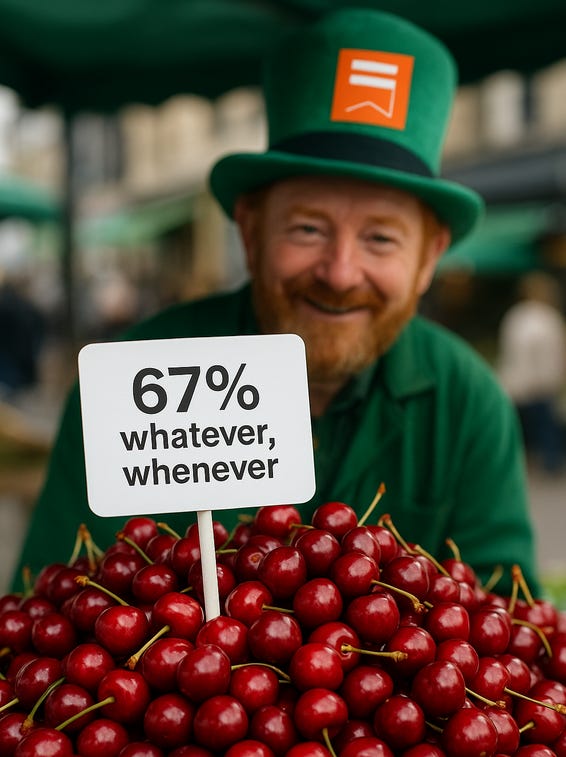 Se spune ca un irlandez se plimba cu fii-su Padraig ala mic prin piata. Ciresele vizibile, frumoase si scumpe. Ala micu’ intreaba “tati, tati, ce gust au ciresele?” Irlandezul ia o cireasa din gramada, i-o da si ii spune “toate celelalte au acelasi gust” si se indeparteaza de pericol.
