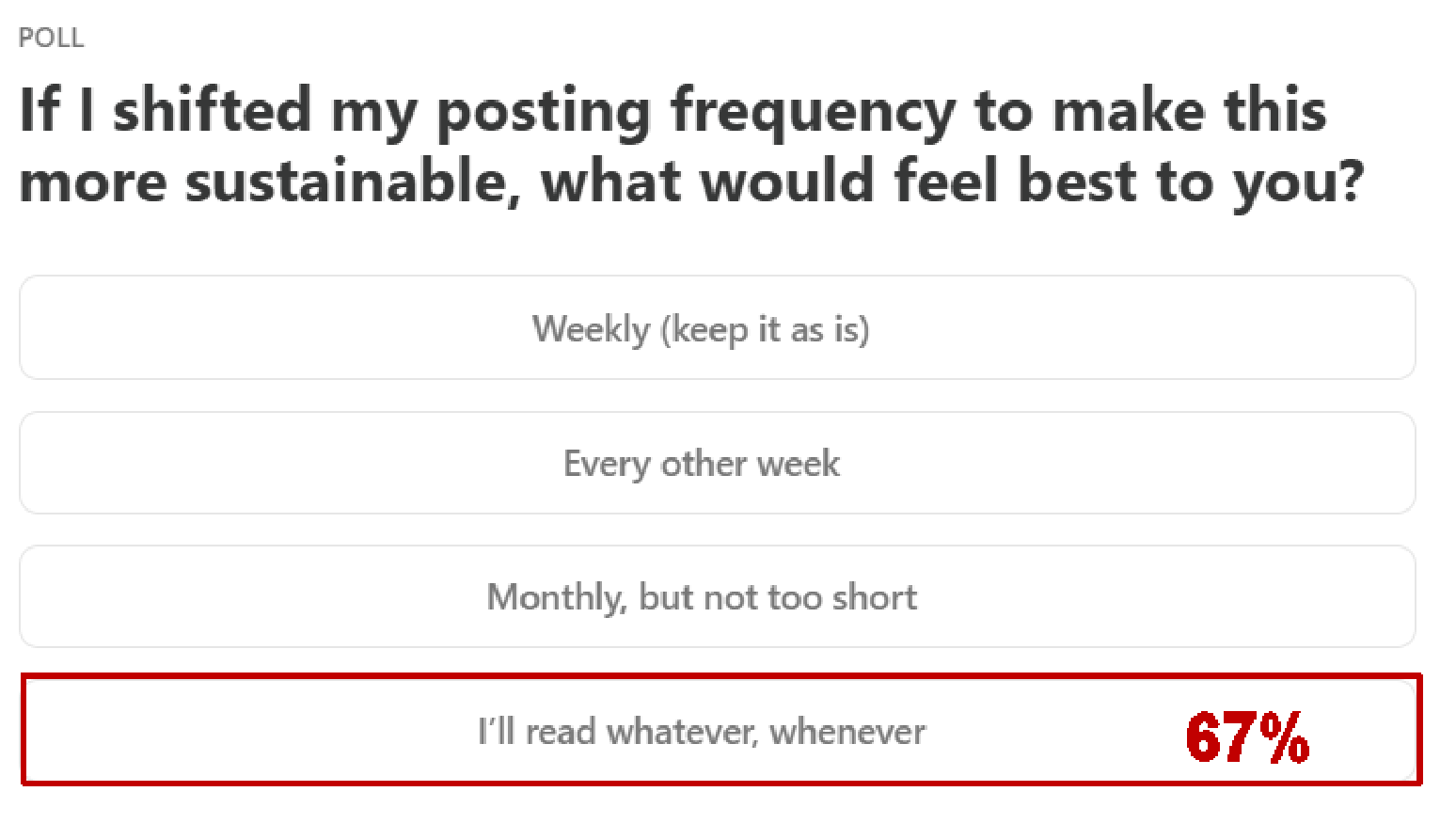 Un psiholog care scrie pe Substack de vreo opt luni, ingrijorat ca poate scrie prea rar sau prea des s-a hotarat sa isi intrebe publicul cam care ar fi frecventa publicarii care le-ar placea cel mai mult. Boala profesionala de a te adapta la ritmul clientului.
