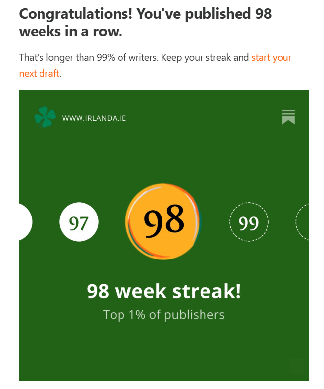 Substack s-a gandit sa imi ridice moralul cam sifonat de furtuna Éowyn care mi-a daramat niste cutii prin curte si mi-a rupt si o scandura din gard si m-a anuntat ca statistic vorbind ma considera de-acum ca facand parte din 1% din substackeri. Nu pentru calitate (cum mi-as dori eu 😊) sau numar de abonamente (cum si-ar dori Substack), ci doar ca am publicat continuu 98 de saptamani. Acum o saptamana ma considera ca fiind doar in 2%.