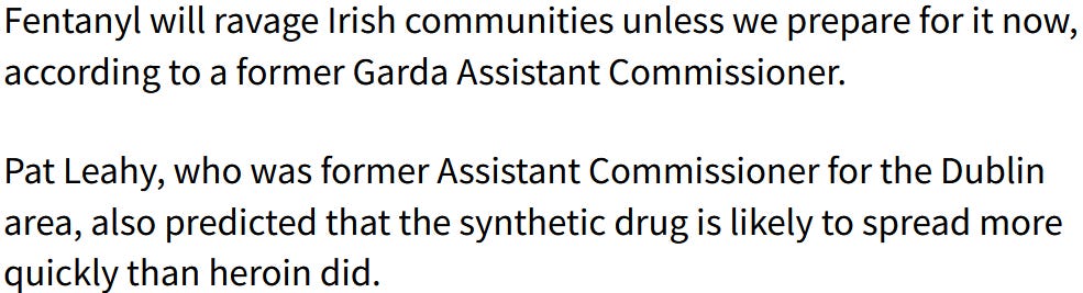 In timp ce rolul Irlandei in lume este recunoscut de expertii in droguri (macar atat) Garda avertizeaza sa ne pregatim de un val de consum de fentanyl care va veni curand peste Irlanda.