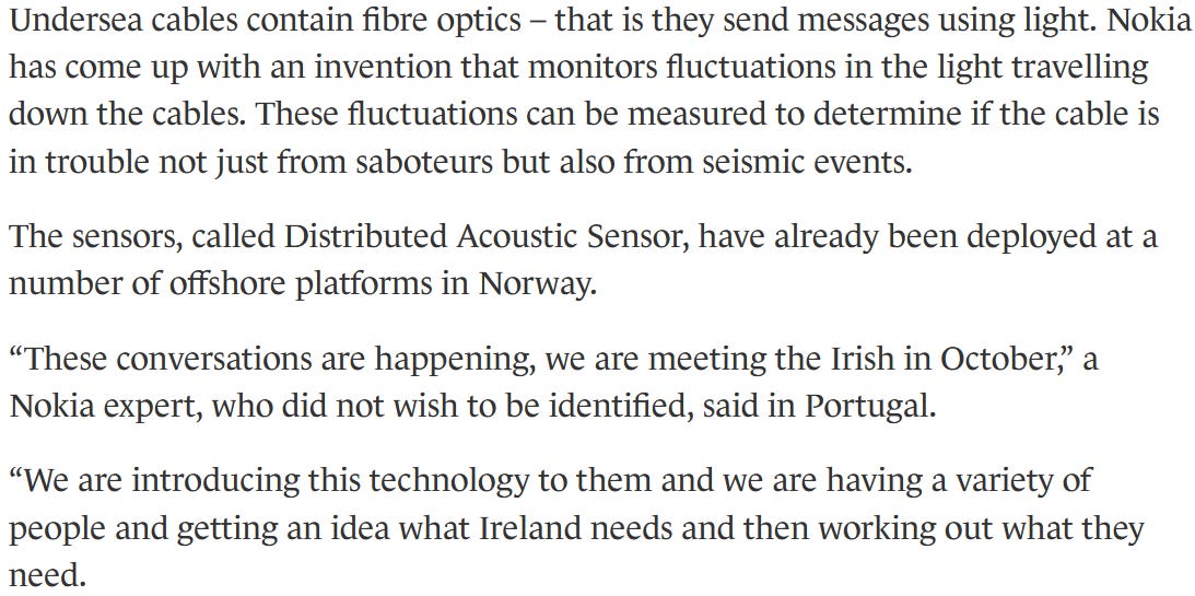 Ingrijorarea s-a amplificat de cand cu sabotajul conductelor subacvatice Nordstream. Sigur, e mica fractura logica aici, Nordstream erau rusesti si intre timp s-a dovedit ca nu si-au sabotat singuri conductele, dar protectia cablurilor irlandeze chiar e necesara. Nu de alta dar sabotorii de la Nordstream cu slava in suflet ar putea incerca un false flag si in Irlanda.