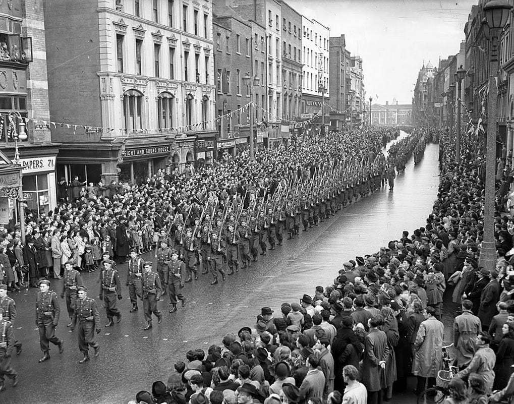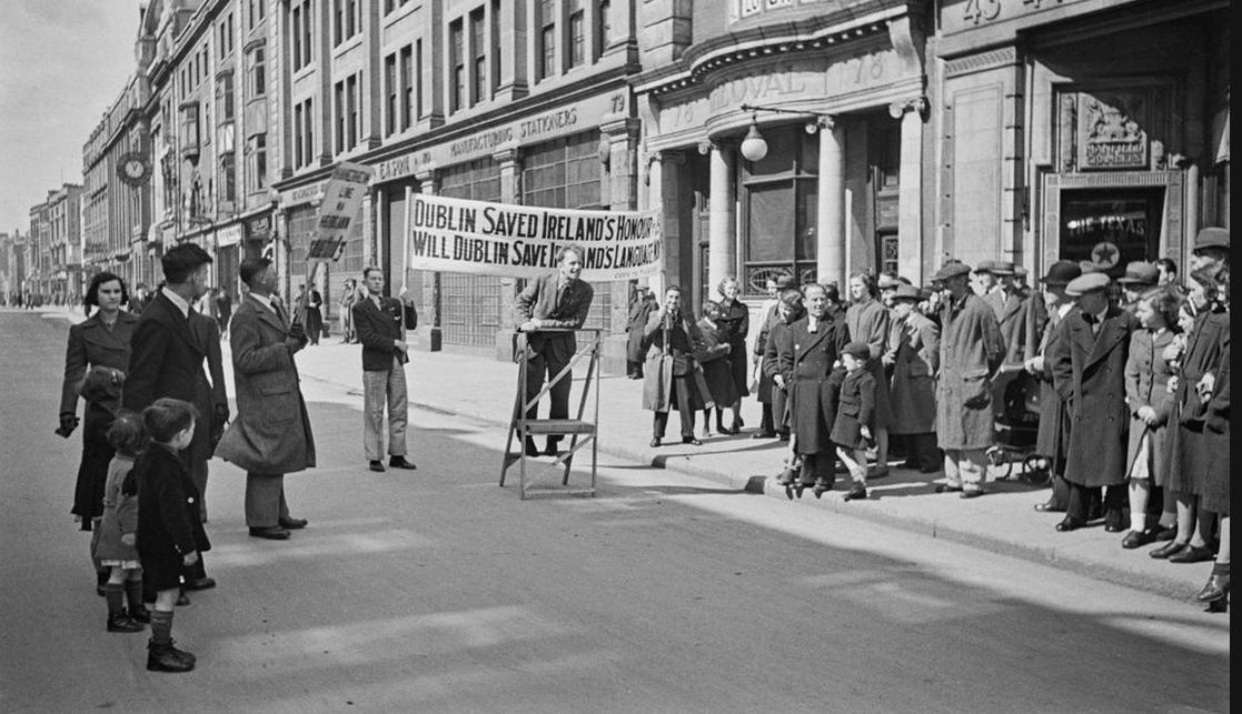 desi considerata in pericol de disparitie limba irlandeza (gaeilge) este destul de prezenta din punct de vedere cultural. Mai ales in emisiuni tv si filme. Ati vazut “An Cailín Ciúin“? Daca nu ar trebui sa il vedeti. Apropos de limba irlandeza, o fotografie istorica cu un protest impotriva neglijarii limbii irlandeze in mai 1941. Pe banner se poate citi 'Dublin saved Ireland's honour, will Dublin save Ireland's language?'.
