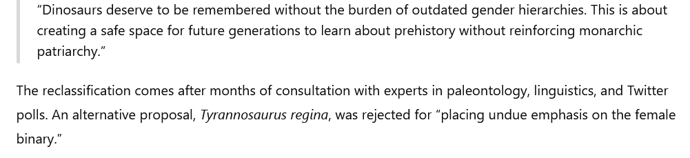 avem nevoie sa abandonam cliseele patriarhale si sa punem denumiri neutre de gen. S-a propus Tyrannosaurus monarch (gender-neutral!), Tyrannosaurus sovereign (pentru vibe-ul de inclusivitate) si Tyrannosaurus R. (ca aici intra si ‘rex’ si ‘regina’ si ‘reginoii’ neclari cu sexualitatea lor).