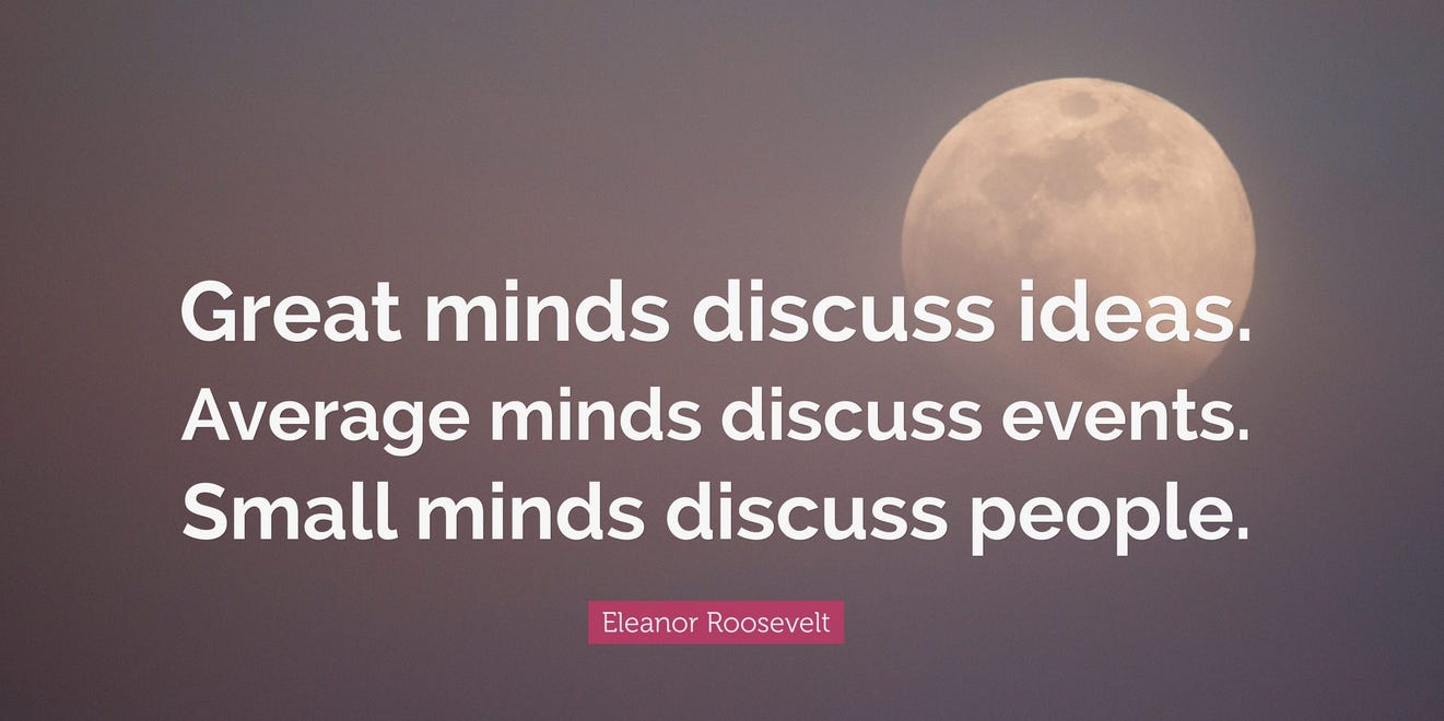 Din beznele internetului tot apare din cand in cand un fel citat-mema-vorba-de-duh, atribuita pe rand la tot felul de personaje, de la Osho la Einstein. Mema zice ca mintile mici discuta persoane, mintile medii discuta evenimente iar mintile mari discuta idei.