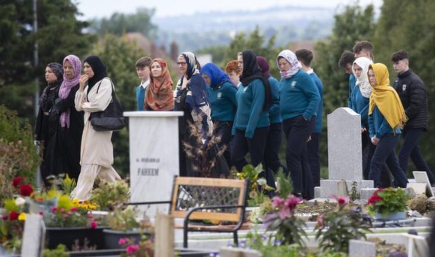 in sfarsit, ultima neliniste pe astazi este ca musulmanii din Irlanda sunt suparati ca n-au cimitire peste tot, asa cum ar fi normal. Adica ei s-au raspandit in cautare de oportunitati in toata Irlanda, oamenii din cand in cand mai mor, iar cimitire islamice sunt doar cateva, in orasele mai mari, cu comunitati musulmane mai consistente. Si atunci trebuie transportat mortul sute de kilometri, ceea ce este evident, o forma de discriminare, ca localnicii din Irlanda nu trebuie sa faca asta, isi ingroapa mortii local, acolo unde s-au nascut. Ceea ce ar trebui sa faca si musulmanii.