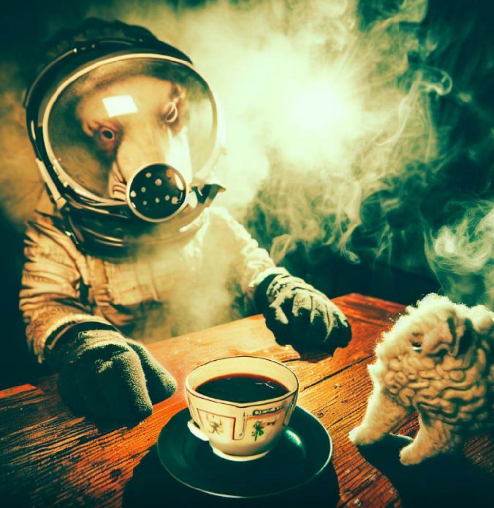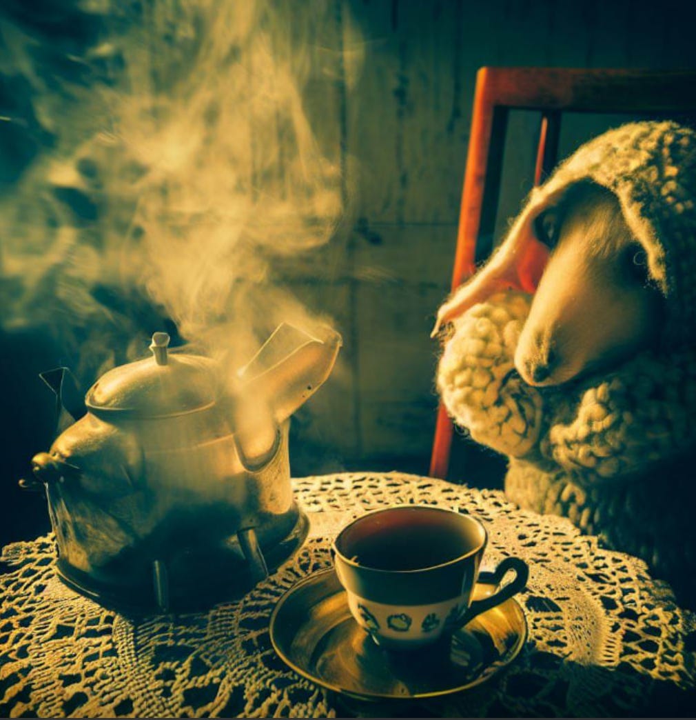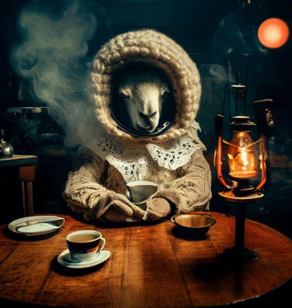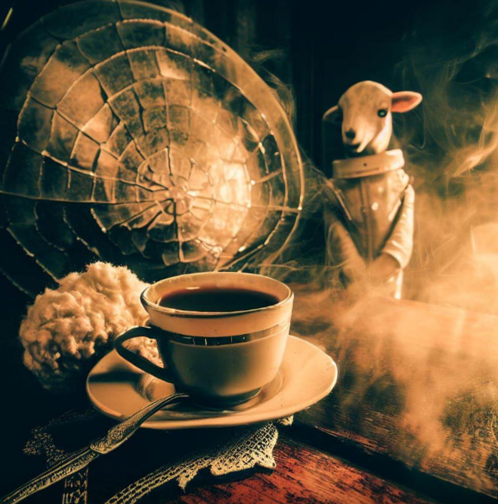 La o cafea cu Mielul cu Asperger. Inalt functional, de remarcat calitatea glugii din lana donata de alti miei neuro-tipici si utilizarea practica a mileului.