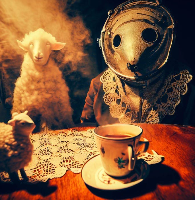 Se pregateste sa supravietuiasca la WWIII si asteapta in costum sa scada radioactivitatea. Are si un miel mai mic pe care il foloseste de “canar-in-mina-de-carbuni“ ca sa vada cand va fi sigur sa renunte la echipamentul de protectie.
