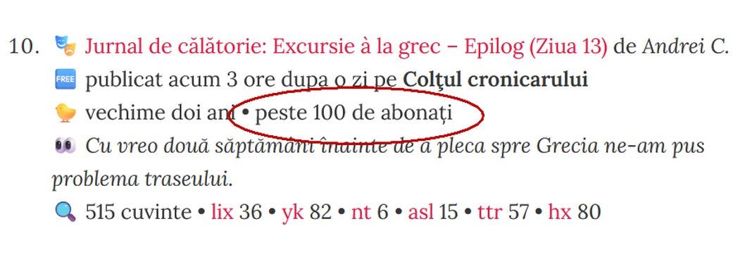 Am introdus si o forma de calculare a vechimii publicatiei si de estimare a numarului de abonati pentru publicatiile care decid sa dezactiveze cele doua. De exemplu la unul din substackerii mei favoriti care a ales sa ascunda publicului larg numarul abonatilor putem vedea asa, “peste 100 de abonati” pana cand ajunge la 1000, moment in care se va schimba in “peste 1000 de abonati”. Sau pana face publc subscriber count-ul, sa stim si noi cu exactitate. 😅