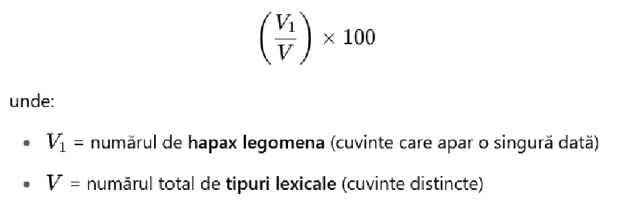 Iar cu hapax legomena ramane cum am stabilit. Pot masura fie sofisticarea, fie constipatia lexicala. Depinde de autor. Decideti voi.
