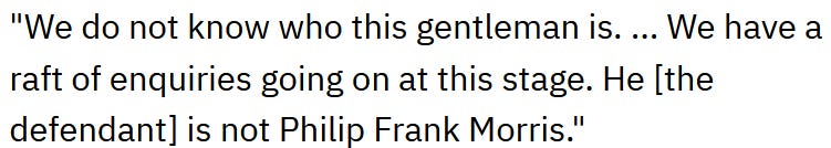 Batranelul n-a fost, evident, deloc cooperant asa ca autoritatile n-au aflat de la el nimic altceva decat ca el este Philip Frank Morris, nascut in decembrie 1952, adica bebelusul mort. Familia bebelusului evident ca nu il cunoaste pe batranel si il considera un impostor.