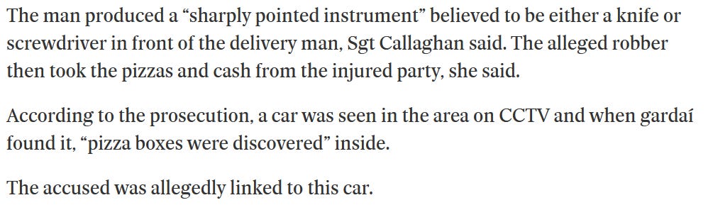 Iti dai seama ca se adanceste criza cand incep talhariile pentru mancare. In Dublin un curier care livra pizza a fost jefuit cu cutitul de cele trei pizza pe care le transporta. Talharul a fost prins ulterior dupa cutiile de pizza goale pe care le avea in masina, ca pe Andrew Tate. Cutiile goale de pizza continua sa bage oameni in puscarie, credeam ca doar in Romania se intampla.