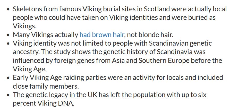 Un studiu facut de universitatea din Bristol sugereaza ca identitatea vikinga nu era conditionata strict de etnie. Probele ADN au aratat ca multi localnici din arhipelagul britanic, irlandezi si scotieni adoptasera identitatea vikinga, beneficiind de inmormantari tipic vikinge, rezervate doar vikingilor.