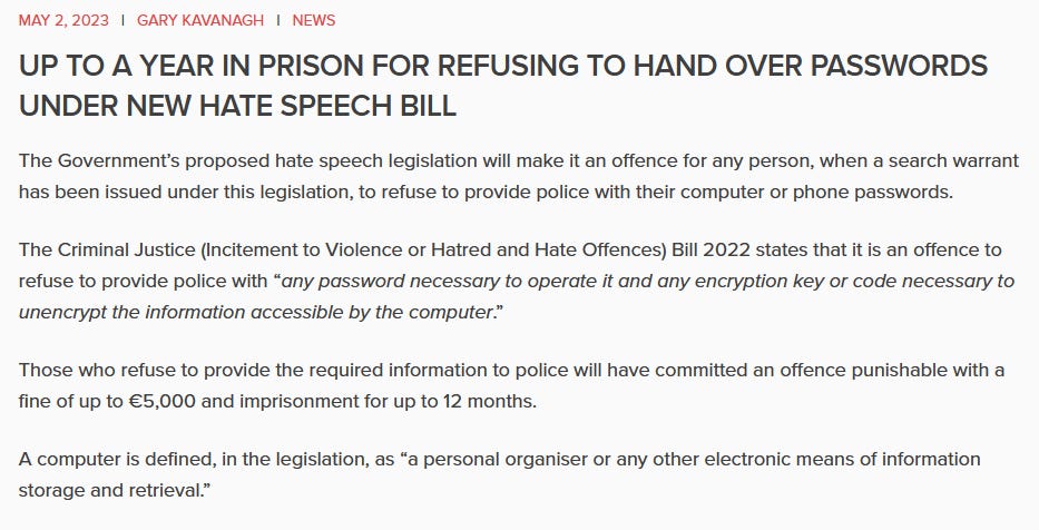 O lege care tocmai este pe punctul sa fie adoptata in Irlanda da fiori mai reci decat ploaia irlandeza. E o lege care intre altele pedepseste cu inchisoare refuzul de a da autoritatilor parola de la calculator, fisiere criptate, telefon etc.