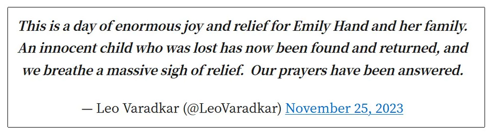 Habar n-am cat de mult au contat pentru Hamas interventiile repetate ale prim ministrului Leo Varadkar, dar probabil ca au contat. Irlanda e una din putinele tari din UE, daca nu cumva chiar singura, care a fost in mod constant de partea palestinienilor si impotriva abuzurilor pe care le indura de zeci de ani. Oficiali irlandezi au vizitat des Gaza iar agentia irlandeza “Irish Aid“ a fost o prezenta constanta in viata celor din Gaza. Daca liderii Hamas au un pic de inteligenta politica probabil ca nu vor sa antagonizeze putinii prieteni pe care ii are poporul palestinian. Imi imaginez ca Leo nu are un backchannel cu Hamas dar mesajul lui public a fost cu siguranta auzit iar Emily Hand, fetita irlandeza in final eliberata. Prietena ei ne-irlandeza, cu care a fost rapita impreuna inca nu.