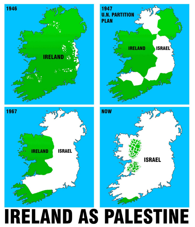 In mod evident cele doua tari nu se simpatizeaza foarte tare, dintr-o mie de motive mai mici si mai mari, mai vechi si mai noi. Irlanda a fost unul din prietenii constanti ai palestinienilor cu bani, cu bunuri si cu pozitii politice ferme. Liderul PLO, Yasser Arafat a vizitat Irlanda inainte ca irlandezii sa le permita israelienilor sa isi deschida o ambasada in Dublin in decembrie 1993. Presedintele Higgins este un simpatizant cu cauza palestiniana cu mult inainte de a deveni presedinte. Irlanda e una din putinele tari europene in care s-a vorbit deschis de un boicot al produselor israeliene, in special al celor produse in teritoriile ocupate ilegal din West Bank.