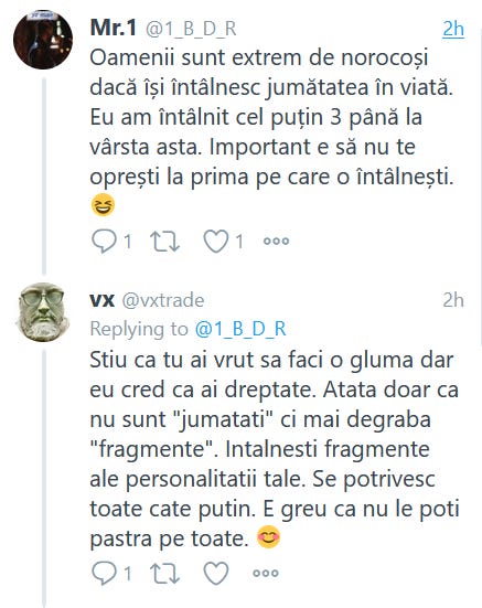 Am intrat din intamplare intr-o discutie pe Twitter in care cineva spunea ca si-a gasit cel putin trei jumatati in viata. Il cred. Sunt suficient de batran ca sa zic been there, done that.