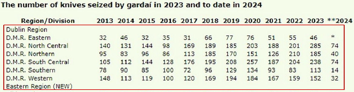 Adica un total de 1253 cutite au fost confiscate pe strazile din Dublin in ultimele 15 luni. Un cutit la fiecare 8 ore. Asta in conditiile in care nu prea este politie pe strazi, ca n-au personal suficient. Ca daca ar fi cu siguranta cifrele ar fi mult mai mari.