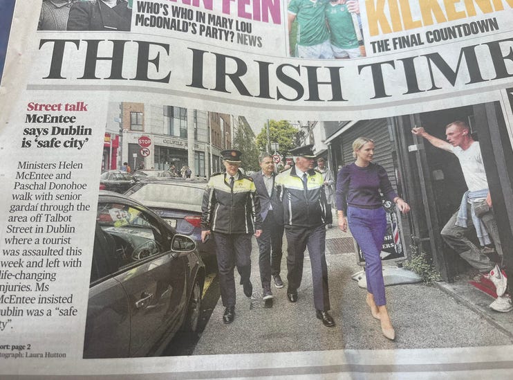 Si poate ati auzit si despre doamna ministra de justitie Helen McEntee, cea care a facut istorie plimbandu-se impreuna cu garda de corp si politia in amiaza mare prin Dublin, pozandu-se cu jurnalistii si declarand ca ea se simte in siguranta pe strazile orasului.
