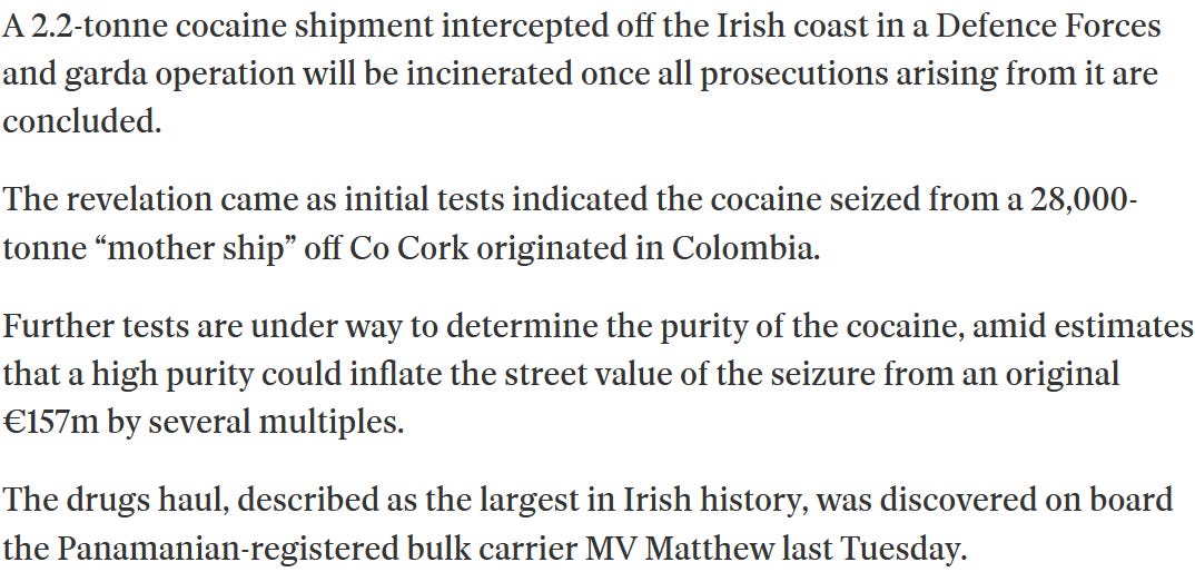 Tocmai citeam ca in curand Garda va incinera 2,2 tone de cocaina pura si ma gandeam ca e una din cele mai proaste decizii pe care o poate lua statul irlandez. Aparent e o decizie logica, de a elimina substanta ilegala de pe strazile Irlandei, unde face mult rau. Violenta etc.