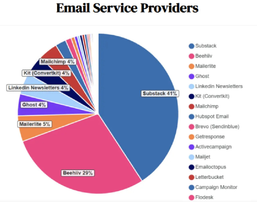 Cat despre platforme lucrurile sunt foarte clare. Substack conduce detasat in preferintele autorilor de newslettere, cu 41%. Iar dupa al doilea competitor, Beehiv, cu 29% restul nu conteaza.