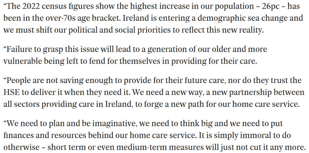 In Irlanda de astazi s-au inchis centre de batrani pentru a fi reconvertite in centre pentru migrantii ucrainieni, mai importanti dpdv politic. Foarte probabil ca si in urmatorii ani migrantii vor avea prioritate in fata batranilor, mai ales ca batranii sunt o problema care tinde sa se rezolve de la sine cu putina rabdare. Migrantii nu.