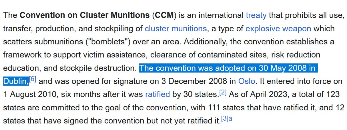 Probabil ca dupa ce va deveni oficial parte din lantul logistic US-Ucraina al bombelor cu fragmentare si va deveni astfel co-autor moral la moartea a mii de civili, Irlanda nu va mai gazui pe viitor prea multe conventii internationale pe teme de pace, dezarmare sau controlul armelor. Ca ar fi usor ipocrit(a) Si necredibila.