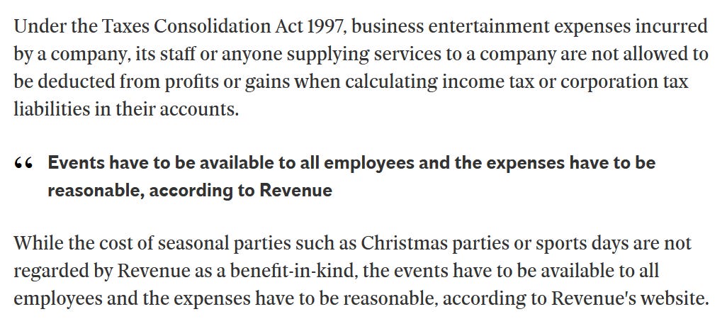Revenue (fiscul irlandez) a inceput sa vaneze companiile care deconteaza un exces de activitati recreative cu angajatii. Petreceri, una, alta. Chiar daca acestea sunt in principiu cheltuieli deductibile atunci cand sunt oferite doar unor angajati si sunt in exces nu se mai califica la ‘gratuitati’ si intra la ‘plata in natura’ (‘benefit-in-kind’).