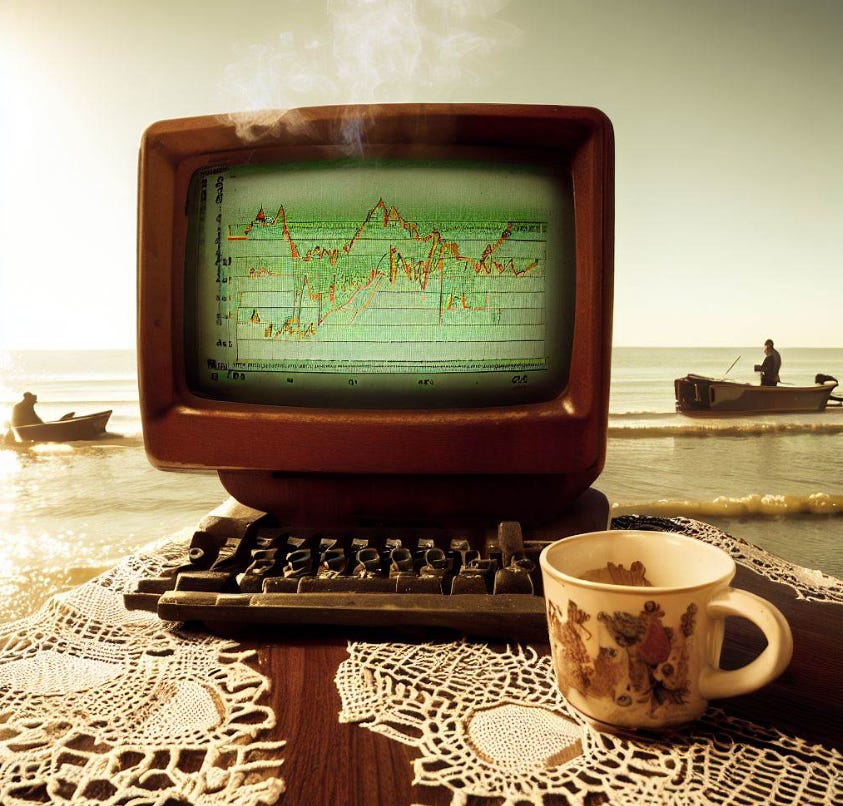 Intr-una din zilele lor de stat la discutii pe malul unei balti cu unditele neatinse nici macar de codita unui pestisor neglijent si discutand ei asa ca pescarii despre asemanarea dintre burse, metodologii de tranzactionare si inteligenta colectiva a pestilor s-a asezat langa ei un alt pescar imbracat umil, cu o undita improvizata dintr-un bat, cu un fir inodat in mai multe locuri, pescar care dupa ce i-a salutat politicos a inceput sa scoata din apa peste dupa peste.