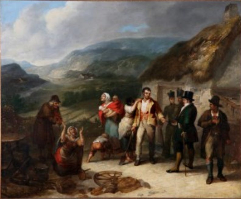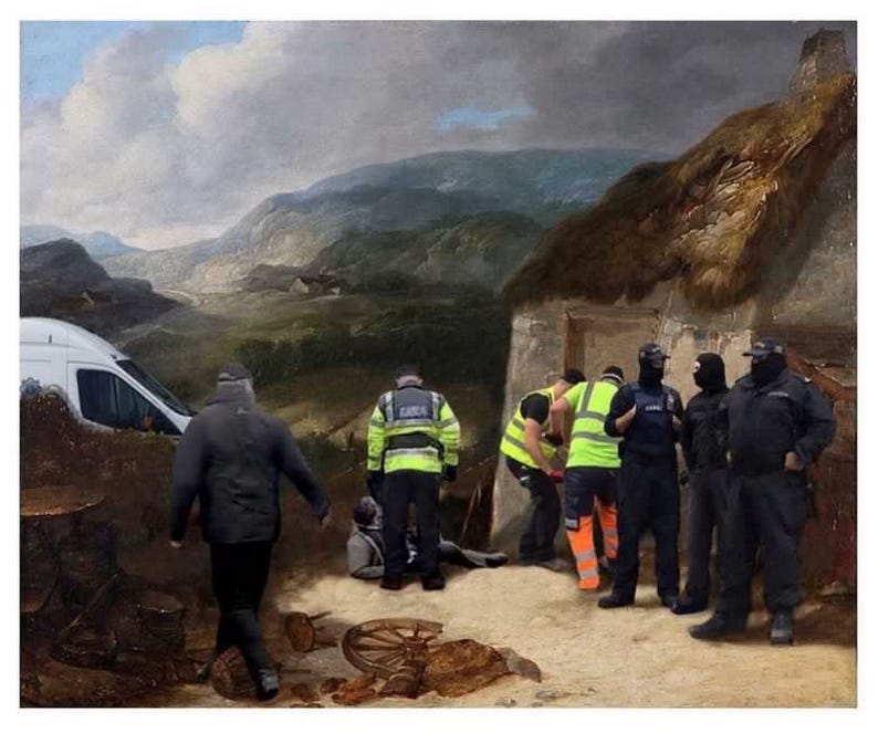 Fotografia de mai jos asa banala cum pare a reusit sa agite rau spiritele in Irlanda in ultima saptamana. Un deputat irlandez mai de la stanga (Eoin Ó Broin, Sinn Fein) a postat-o pe Twitter. Este un colaj satiric facut de artista Mála Spíosarí care a modificat intr-o pictura scena in care englezii evacueaza din casa niste irlandezi saraci in timpul Foametei. Artista in ale photoshopului a inlocuit landlorzii englezi cu politisti irlandezi de astazi, o aluzie fina la chiriasii din zilele noastre carora li se termina contractele si nu prea au unde sa se duca pentru ca nu exista case ieftine de inchiriat. Pentru ca au fost ocupate de ucrainieni, africani si alti oaspeti ai guvernului irlandez.
