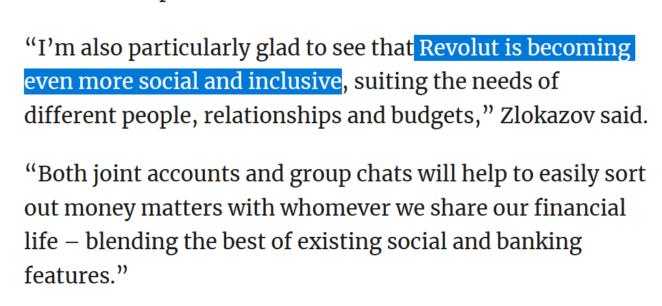 Revolut a lansat (si) in Irlanda conturi comune si un sistem de chat direct in aplicatie. Sa poti sa schimbi doua vorbe cand dai banu’. Ideea nu e rea, desi eu raman pe Telegram, ca imi acopera majoritatea nevoilor de comunicare.