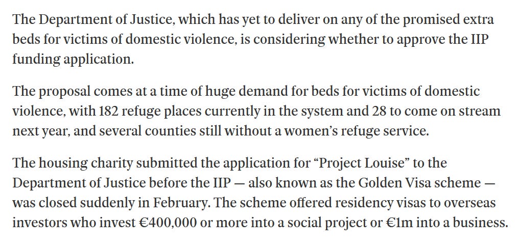ce inseamna sa simti spiritul vremurilor. Un investitor strain care vrea sa se califice pentru controversatul program de acordare de vize irlandeze contra investitii (asa-numita Golden Visa Scheme) a propus un proiect de a face 65 de case pentru victime ale violentei domestice. Si desi programul āGolden Visaā era practic blocat Ministerul Justitiei ia in calcul acest proiect, pentru ca e prea juicy ca sa il ignore. Punem pariu ca il accepta? Ce inseamna sa fii destept. Chapeau!