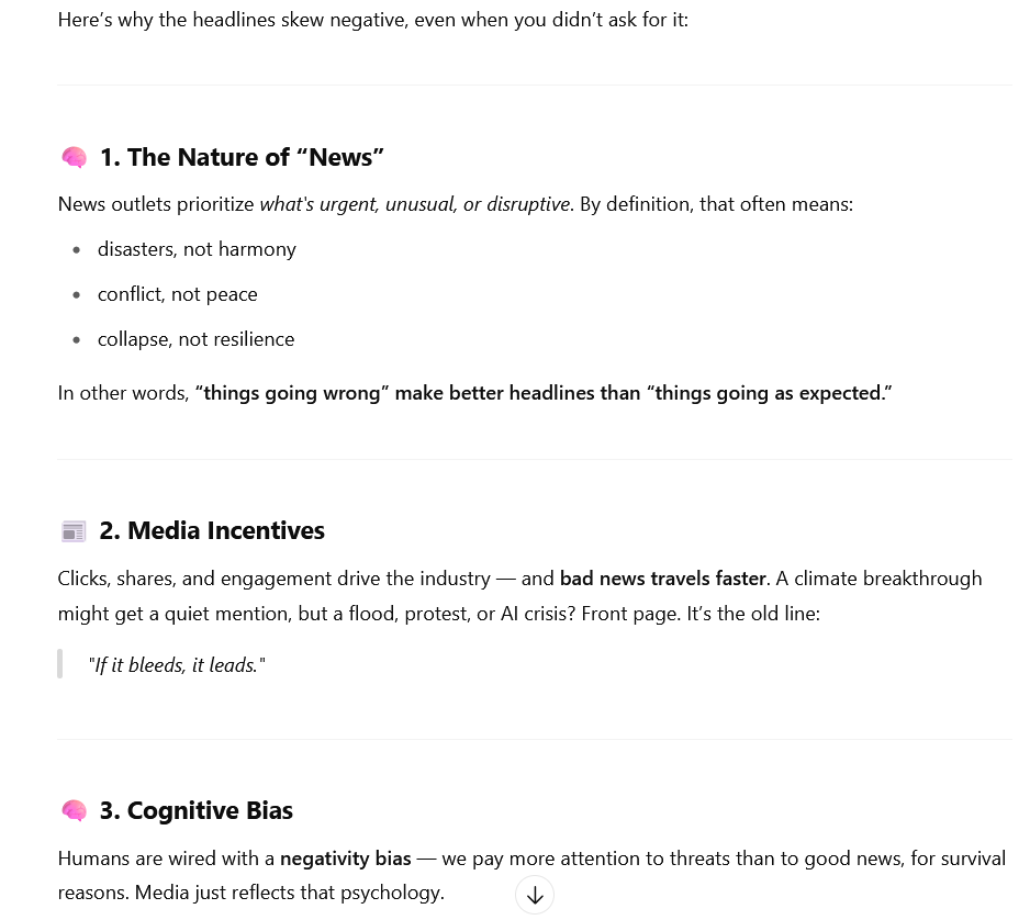 Argumentele lui Geppetto sunt bune. Stirile prioritizeaza ce se schimba, nu ce ramane stabil. Stirile prefera ce se schimba dramatic, nu ce se schimba lent, evolutiv. Evenimentele negative (crize, dezastre, scandaluri) sunt disruptive si noi — deci mai "demne de stiri" decat stabilitatea sau progresul.