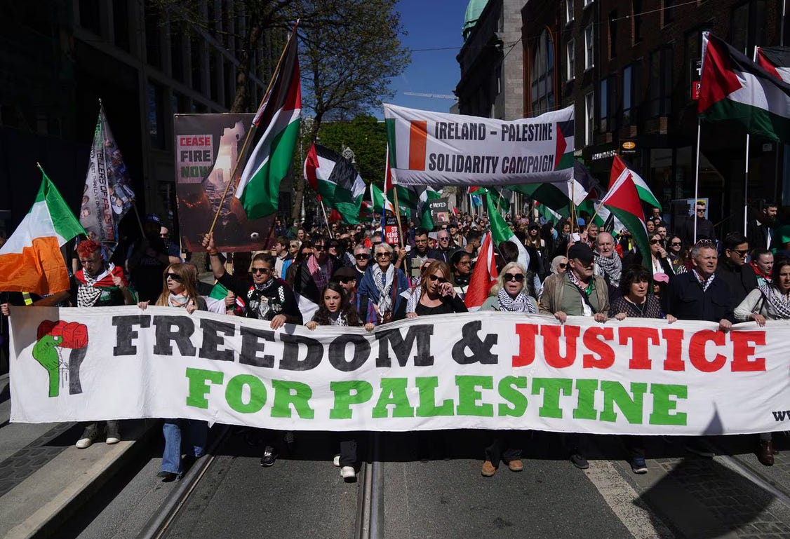 zeci de mii de oameni au participat duminica in Dublin la un mars de solidaritate cu tragedia palestinienilor. Dupa unele estimari au fost 60.000 de participanti.