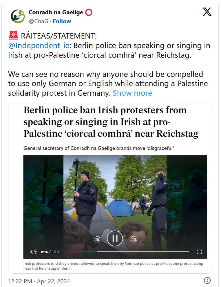 politia germana a solicitat unui grup de activisti irlandezi care protestau langa Reichstag in limba irlandeza (gaeilge) sa inceteze a folosi irlandeza. Pentru politia germana singurele limbi acceptabile in care se poate protesta sunt germana si engleza, celelalte ar fi ilegale (sic!). Degeaba au incercat activistii sa le explice cum ca irlandeza e limba oficiala in UE, ca n-au avut succes.